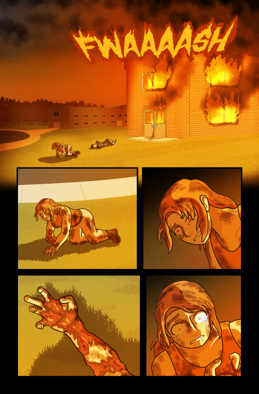 Panel 1: Large panel. Nighttime, a short but large brick building is burning on one end. Two people are on the grass outside. One on their back clutching at their neck, the other crawling away, cradling their right arm. SFX: FWAAAASH Panel 2: Closer on the crawling figure. She is covered in soot and the arm she is cradling is burned. Panel 3: Close on her face, she is crying as she looks down. Panel 4: Close up of her burned arm. The burns are deep, penetrating beyond the skin. Tendons and muscle are visible and damaged. Panel 5: Her eyes go wide in horror as she realizes the extent of the damage. She continues to cry.