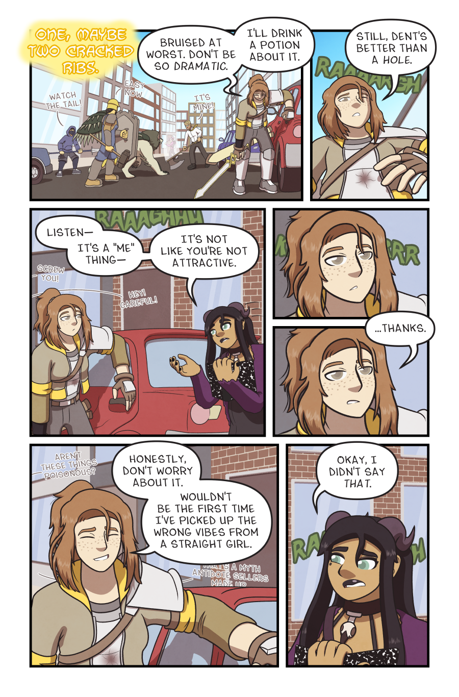 Panel 6: Dani amiably waves off Mira's explanation. DANI: "Honestly, don't worry about it. Wouldn't be the first time I've picked up the wrong vibes from a straight girl." "Aren't these things poisonous?" " "That's a myth antidote sellers made up"