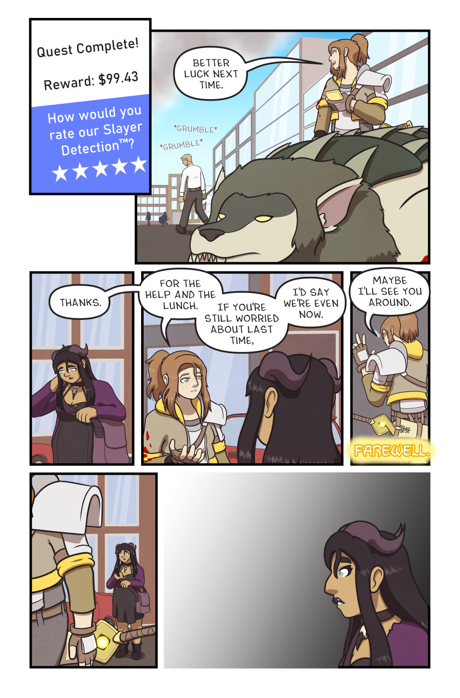 Panel 1: A phone screen reading "Quest Complete! Reward: $99.43 How would you rate our Slayer Detection™?" with a 1-5 star rating selector Panel 2: Dani holding her phone, standing over the dead manticore while the other adventurers walk away. DANI: "Better luck next time." AXE GUY: "*grumble* *grumble* Panel 3: Mira pulling her bag back on. DANI: "Thanks." Panel 4: Dani talking to Mira. DANI "For the help and the lunch. If you're still worried about last time, I'd say we're even now." Panel 5: Dani waves as she walks away. DANI "Maybe I'll see you around." RADIANCE: "Farewell." Panel 6: Mira watches Dani walking away. Panel 7: Mira thinks.