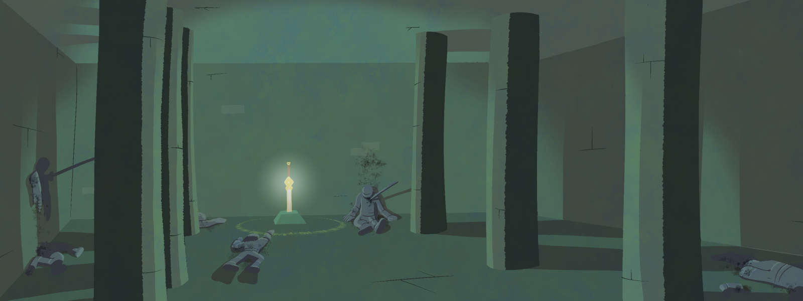 The man crept carefully into the chamber. He wore a mix of armors, a rough iron breastplate over a mish-mash of leathers and padded twill. He was several days unshaven, with a cross of scars on his face. Not exactly a shining paladin in glistening plate, but Radiance was several years or days past being picky. He looked at her, standing proud and shining in her pedestal, and continued to glance carefully around the chamber. His eyes fell upon the bodies, and he paused. He kneeled over them, seeming to examine their state. He used a booted foot to turn one of them over. The dusty, armored almost skeleton clattered over, revealing the holes from which he had bled to death so long ago.
